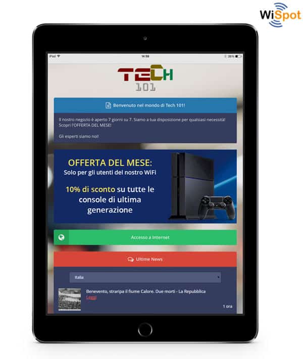 È la pagina di benvenuto, una pagina web che viene mostrata a tutti gli utenti connessi al WiFi della tua attività, attraverso cui fornire ai clienti informazioni di ogni genere. In essa puoi comunicare i tuoi orari e giorni di chiusura, puoi offrire uno sconto dedicato solo agli utenti del WiFi, puoi consigliare locali convenzionati nelle vicinanze o fare pubblicità ai tuoi prodotti migliori.